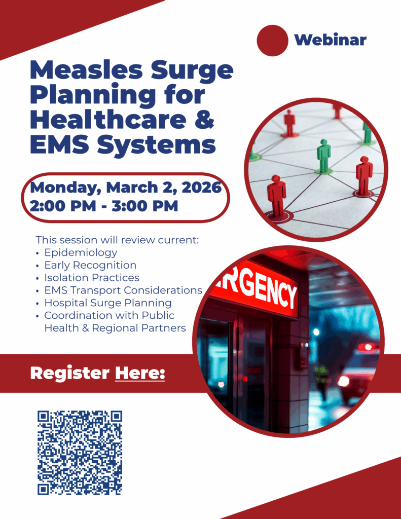 This focused webinar is designed to help healthcare and EMS professionals strengthen readiness for a potential measles event. This session will review current epidemiology, early recognition and isolation practices, EMS transport considerations, hospital surge planning, and coordination with public health and regional partners. Participants will gain practical, operational strategies to protect staff, maintain continuity of care, and reduce secondary exposures across the healthcare system. This webinar is ideal for EMS leaders, emergency department staff, infection prevention teams, hospital administrators, and preparedness professionals.